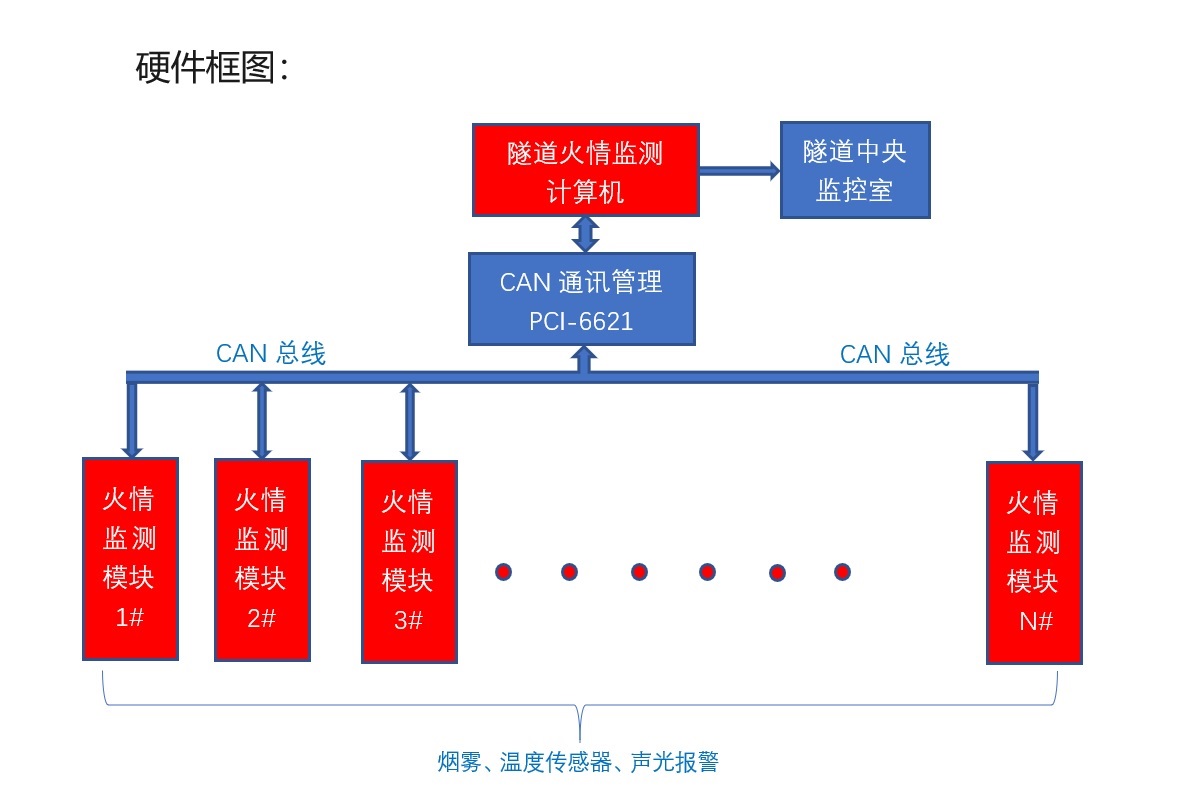 我所和隧道設(shè)計施工運營公司配合參與了西部某隧道整體設(shè)計、提供了火災(zāi)監(jiān)控系統(tǒng)相關(guān)產(chǎn)品。該系統(tǒng)由隧道火情監(jiān)控計算機、CAN通訊控制卡、測控模塊、前端傳感器等部分組成,涵蓋了數(shù)據(jù)采集、數(shù)據(jù)通訊、數(shù)據(jù)分析處理、報警等功能。